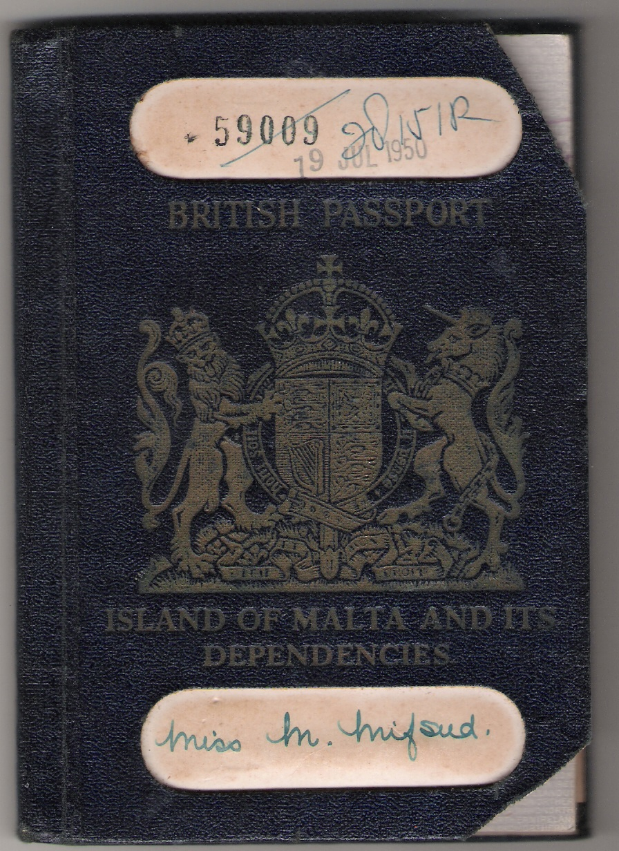 This is a British passport issued for the Island of Malta and its Dependencies, belonging to a Miss M. Mifsud dated 19 July 1950. It represents Malta's colonial period when Maltese citizens travelled on British passports before the Islands gained independence in 1964.