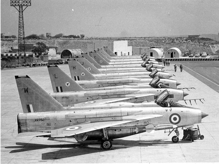 An interesting photograph of Electric Lightning supersonic interceptor jets of the Royal Air Force, at RAF Luqa in Malta, likely during the 1960s.