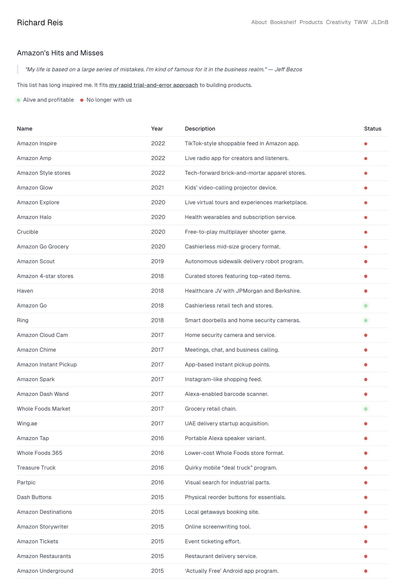 A list of Amazon's experimental product launches between 2015-2022, showing which succeeded (green dots) and which were discontinued (red dots). It illustrates Amazon's aggressive trial-and-error approach to innovation, with only three products still alive and profitable out of dozens of attempts, embodying Jeff Bezos's philosophy that failure is essential to learning and eventual success.