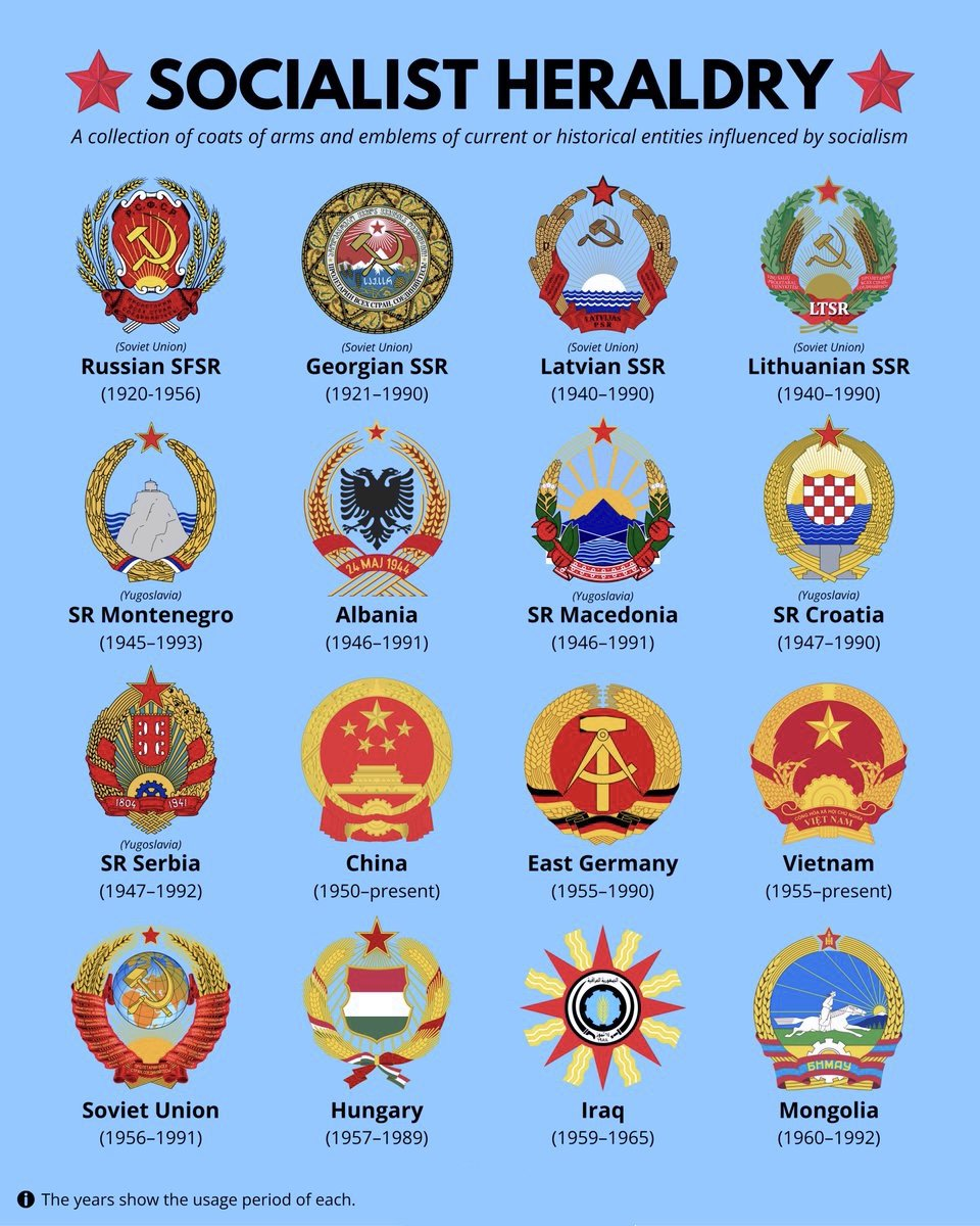 A collection of the official state emblems and coats of arms from 16 socialist and communist countries throughout the 20th century, including Soviet republics, Eastern Bloc nations, and other socialist states.