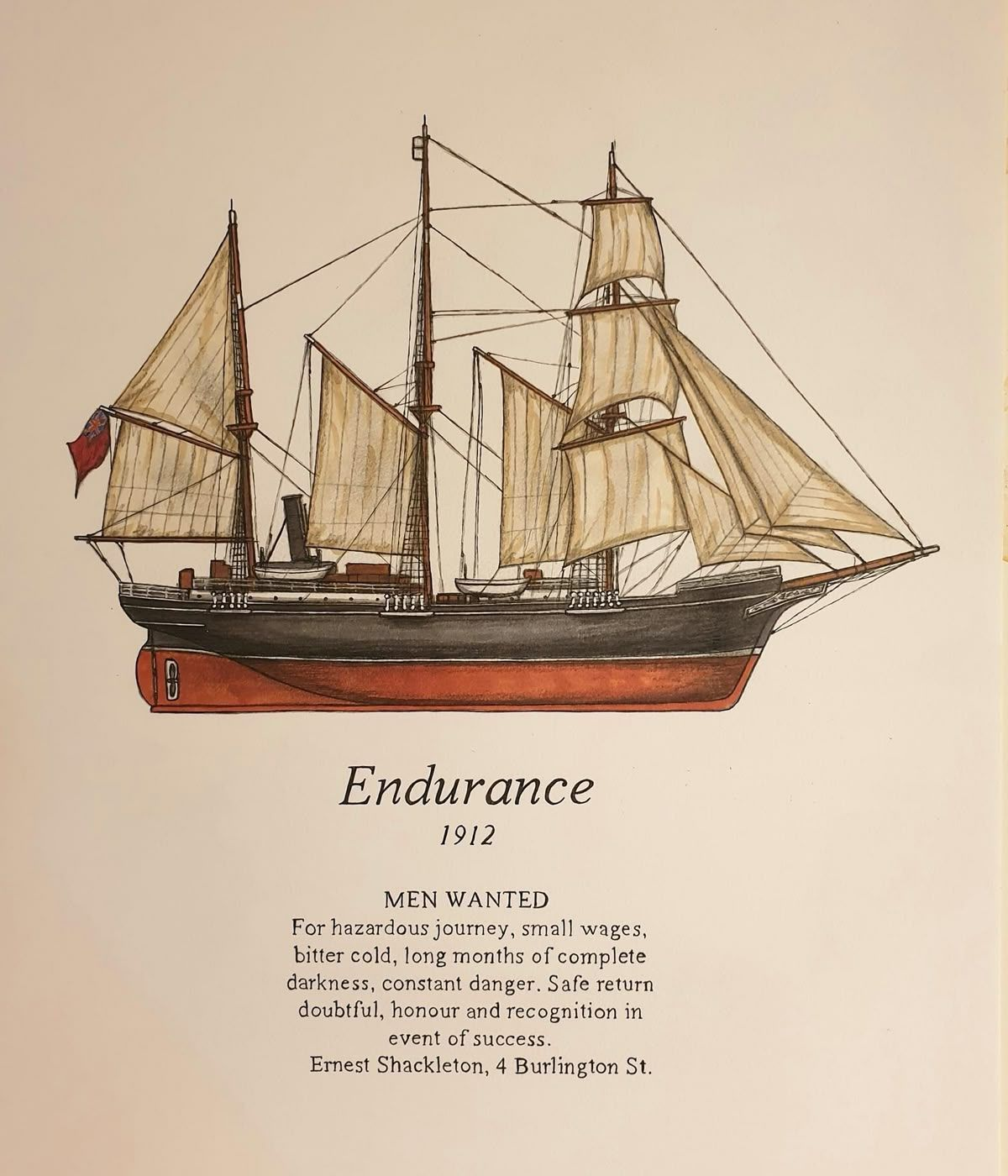 A copy of Ernest Shackleton's famous 1912 recruitment advertisement for the Imperial Trans-Antarctic Expedition aboard the Endurance, which became legendary for its honest description of the dangers involved. The ad's warning of "hazardous journey, small wages, bitter cold, long months of complete darkness, constant danger" with "safe return doubtful" has become iconic in leadership and adventure literature.