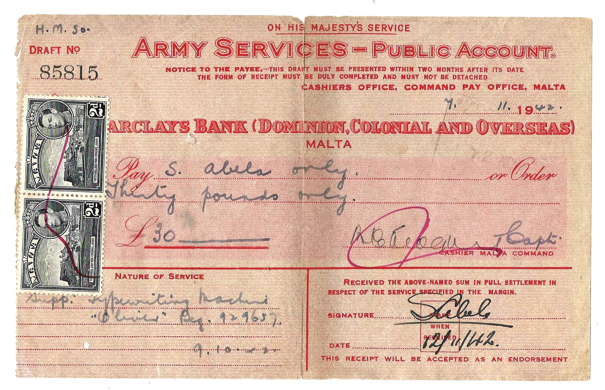 A British Army pay cheque from World War II Malta from 1944, issued for £30 through Barclays Bank. It was used to pay military personnel stationed in Malta during the war, with revenue stamps affixed.
