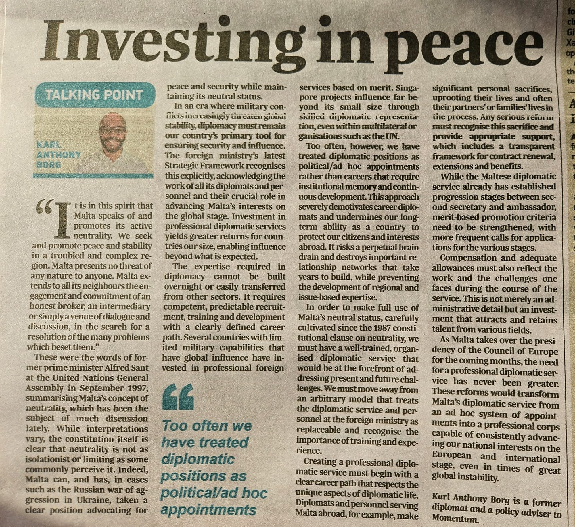 Earlier this year, my article was published on 'Times of Malta', Malta's longest running daily newspaper. I wrote about a subject close to my heart - especially being a former diplomat - namely, the importance of having a professional, well trained, and motivated diplomatic corps, especially for a small country like Malta and in light of the current international scenario. You can read the full article here.